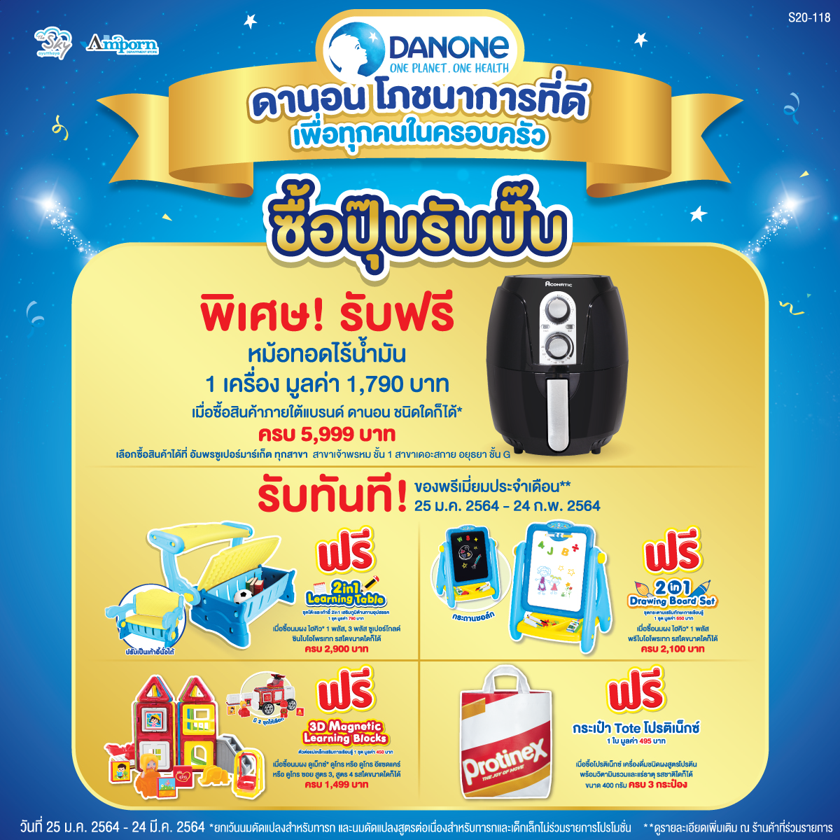 ซื้อปุ๊บรับปั๊บ! รับฟรีหม้อทอดไร้น้ำมัน 1 เครื่องมูลค่า 1,790 บาท เมื่อซื้อสินค้าภายใต้แบรนด์ ดานอน สูตร 3 สูตร4 ชนิดใดก็ได้ ที่ร่วมรายการ*** ครบ 5,999 บาท