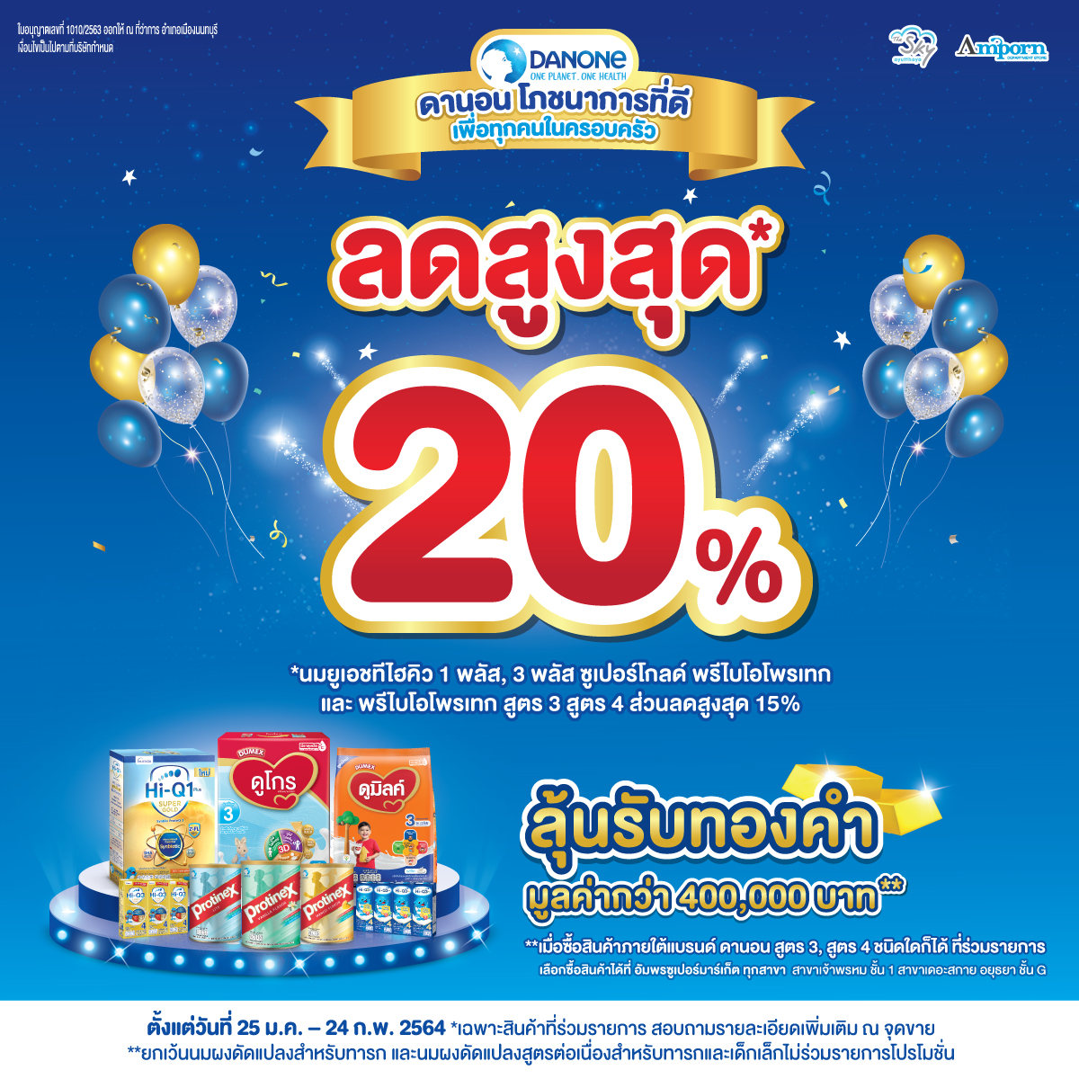 โปรโมชั่นพิเศษ!! ลดสูงสุด 20%* เมื่อซื้อสินค้าดานอน สูตร 3 สูตร 4 ที่ร่วมรายการ พร้อมลุ้นรับทองคำและของพรีเมี่ยมประจำเดือน กุมภาพันธ์ ดังนี้